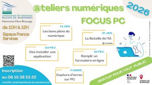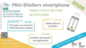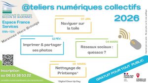 * Ateliers collectifs sur smartphone et ordinateur, proposés à Marennes-Hiers-Brouage à l’Espace France services ouverts à tous les habitants du Bassin de Marennes ; nouveau lien pour inscription en ligne